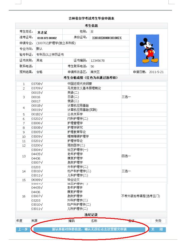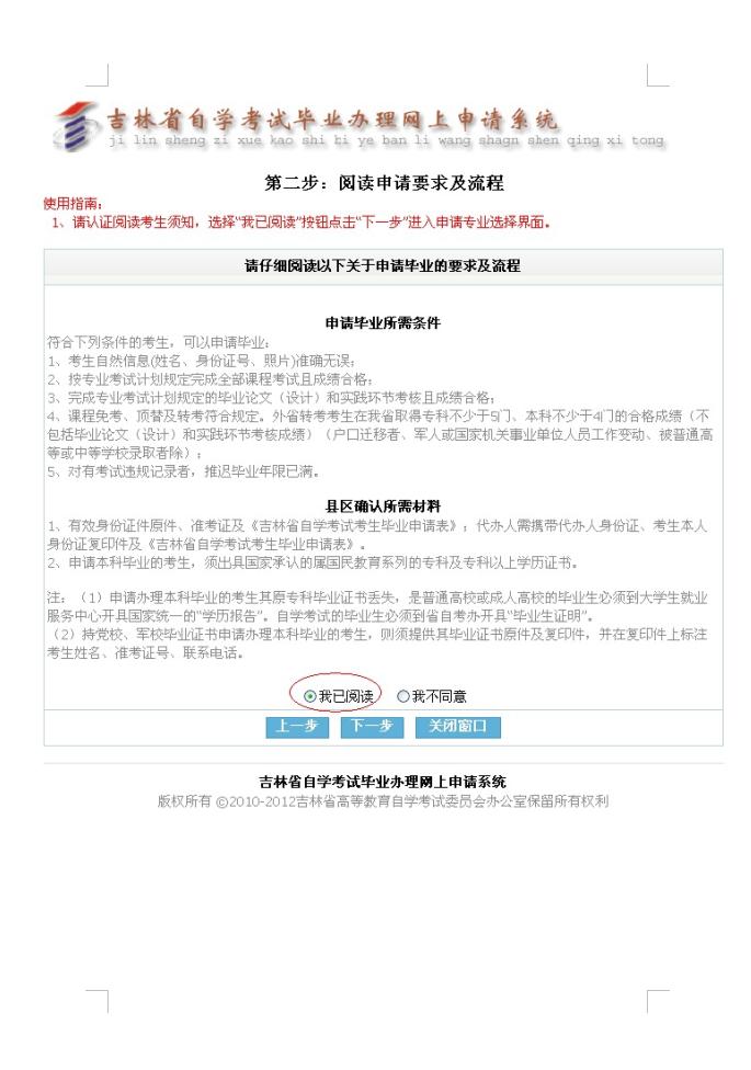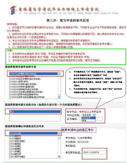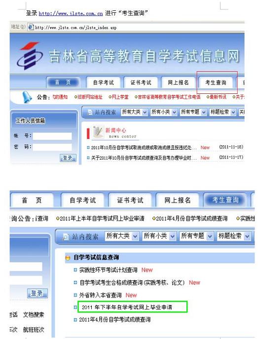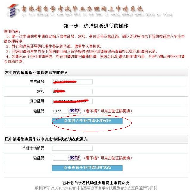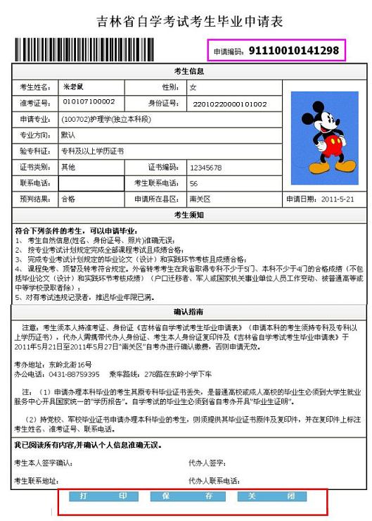 2014年5月21日至27日吉林省自考生(逾期不予補辦)登錄吉林自考信息網(wǎng)http://www.www.gzhqk.com/shownews.asp?id=1428 進 “考生查詢” 點擊”2014年下半年自學考試網(wǎng)上畢業(yè)申請” 提交信息,申請成功后將生成《吉林省自學考試考生畢業(yè)申請表》(簡稱申請表),檢查各項信息無誤打印申請表簽字確認,并按要求攜帶相關證件將申請表交至所屬縣自考辦進行現(xiàn)場確認。如下為辦理手續(xù)舉例圖: