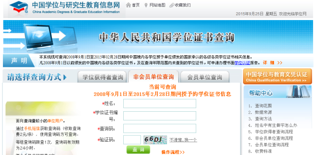 本系統(tǒng)現(xiàn)可查詢2008年9月1日至2015年02月28日期間中國(guó)境內(nèi)各學(xué)位授予單位按照有關(guān)規(guī)定程序頒發(fā)的各級(jí)各類學(xué)位證書(shū)相關(guān)信息。