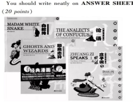 第一段What an impressive an instructive imagine it is! The imagine presents us some Chinese classics, such as The Analects of Confucius, Zhuang Zi Speaks, and so on. But the scrutiny of the picture reveals a secret – these representatives of the Chinese culture are all in forms of English version comic. Predictably, these easy-to-understand versions will appeal to a growing body of foreign readers.